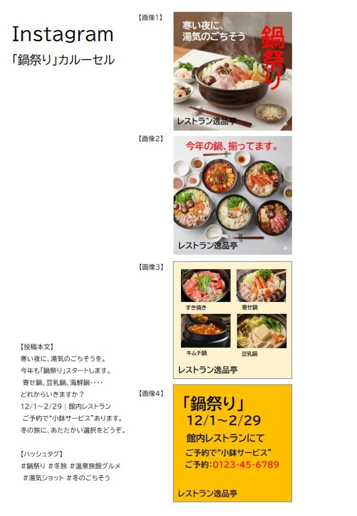 素材が揃ったら、館内POPやSNSでの案内づくりへ。POPは「何の鍋がいくらで食べられるのか」「いつから提供するのか」をシンプルにまとめるのが鉄則。SNSは投稿の見栄えが命なので、鍋の寄り写真と共に“湯気感”を伝えるコピーを添えましょう。例:「寒い夜にほっと一息。今夜はどの鍋にしますか?」など、読み手の日常に寄り添った言葉が効果的です。