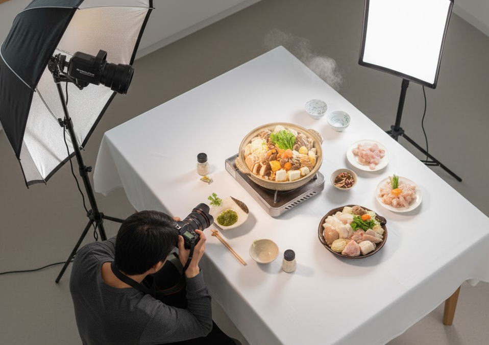 次に写真撮影を行います。鍋の湯気は“おいしさのシンボル”なので、できれば加熱しながら撮影するのが理想。背景は木目や布など落ち着いた素材を使い、「冬のあたたかさ」を感じる雰囲気をつくります。1品ずつのカットに加え、全種を並べた集合写真も後の販促ツールで大活躍します。